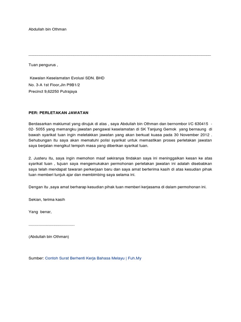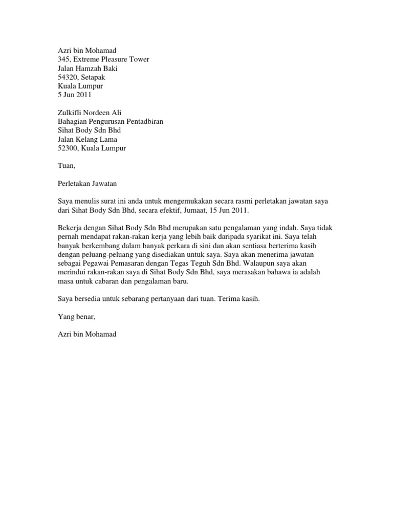 Contoh Surat Perletakan Jawatan Pdf